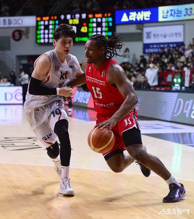 26일 안양 정관장 아레나에서 열린 ‘2024-2025 프로농구’ 정관장과 KT 경기에서 정관장 버튼이 KT의 수비를 뚫고 골밑을 공격하고 있다. 안양|김종원 기자 won@donga.com