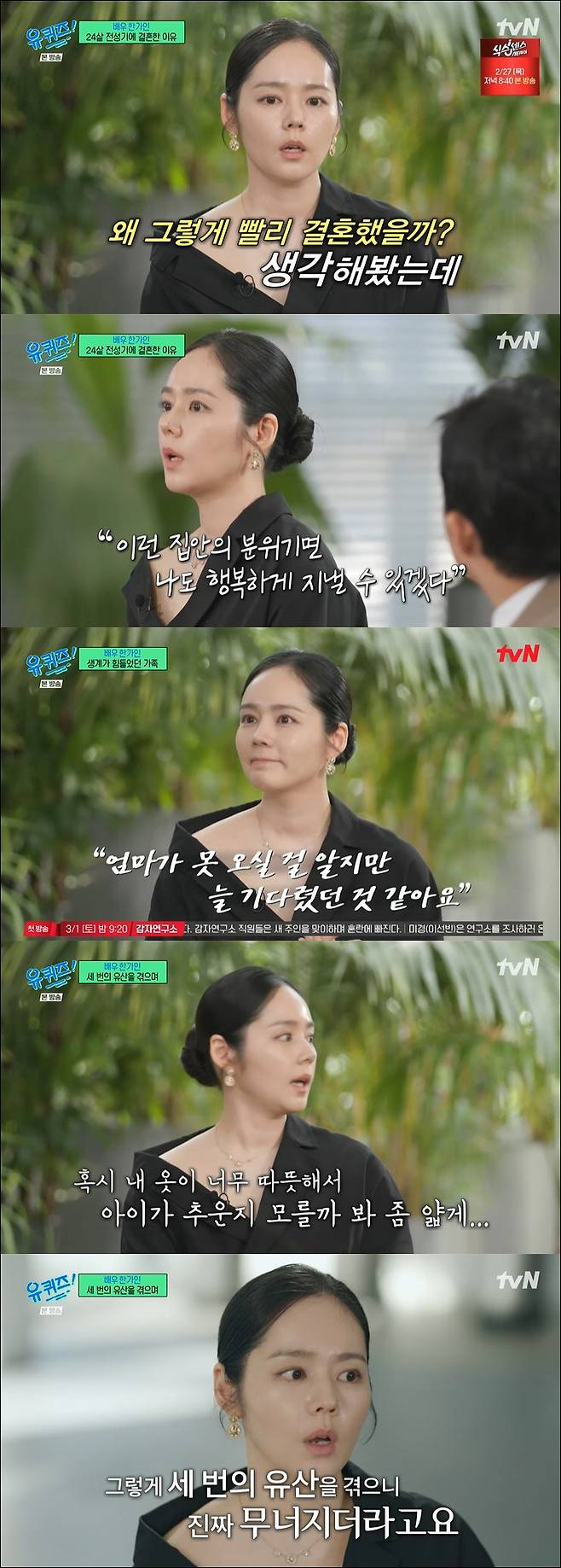 24살이라는 이른 나이에 결혼한 한가인은 "'왜 그렇게 빨리 결혼했을까?' 생각했는데 남편과 첫 드라마에서 만났고 남편의 집에서 데이트를 했다. 가족의 분위기를 봤는데 너무 화목하고 이런 집안의 분위기면 나도 행복하게 지낼 수 있겠다 싶었다"며 "그때 제가 갑자기 연기를 하게 되고 사람들의 관심을 받으면서 너무 힘들고 어디론가 도망가고 싶었다. 도망치고 싶었던 마음도 있었다"고 밝혔다.