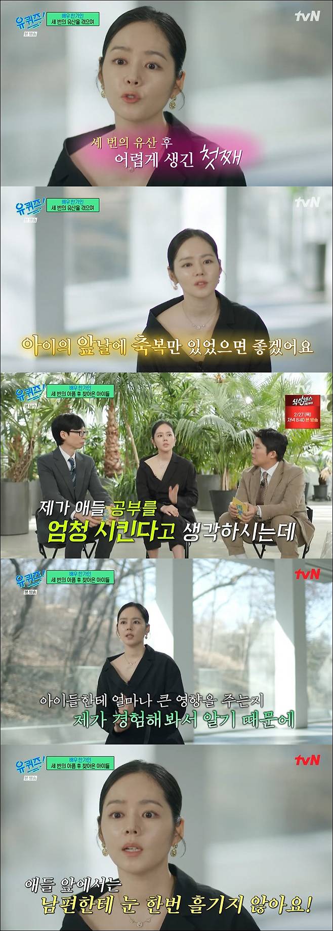 화목하지 못한 가정, 빠듯한 생계로 결핍이 있었다는 한가인은 "나중에 엄마가 되면 '지금 내가 되고 싶은 엄마가 되어야지'라는 생각을 정말 많이 했다. 어릴 때 바깥에 비가 오면 저희 엄마는 한번도 저를 데리러 오지 못했다. 엄마가 안 오실 걸 알지만 늘 기다렸던 거 같다. 마지막까지 기다리다가 집에 걸어오곤 했는데 나는 엄마가 되면 비가 올 때 우리 학교 앞에 제일 먼저 오는 엄마가 되고 싶었다"며 "아이가 어릴 때 추우면 저는 옷을 얇게 입었다. 아이는 추운데 내가 따뜻해서 모를까 봐 저는 얇게 입는다"고 눈물을 보였다.