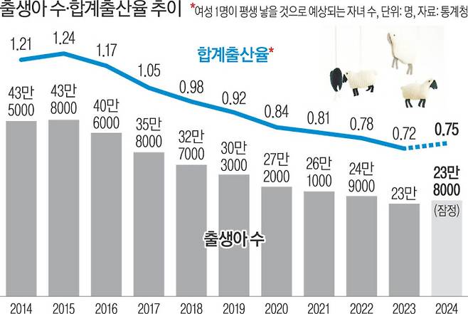 ‘0.75명’이라는 수치도 통계청의 6년 전 추계치보다 낮다. 통계청은 2019년 발표한 장래인구 특별추계에서 1990년대생 여성들이 30대 초반에 진입하는 2022년부터 합계출산율 1명대를 회복할 것으로 전망했다. 정작 2022년 합계출산율은 0.78명에 그쳤고 2023년엔 0.72명으로 더 떨어졌다.
