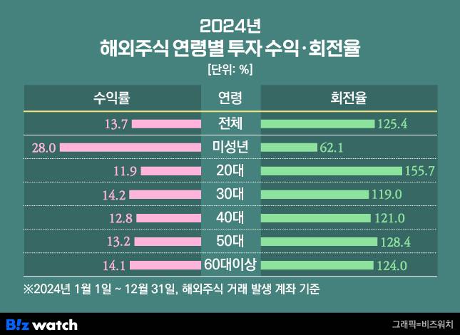 수익률 1위는 20대 미만 미성년자가 차지했다. 무려 20%대 중후반 수익률을 내며 '어른' 투자자들을 압도했다. 반면 20대는 11%로 가장 낮은 수익률을 냈다. 동시에 20대는 매매 회전율이 압도적으로 높은 연령군으로 나타났다.