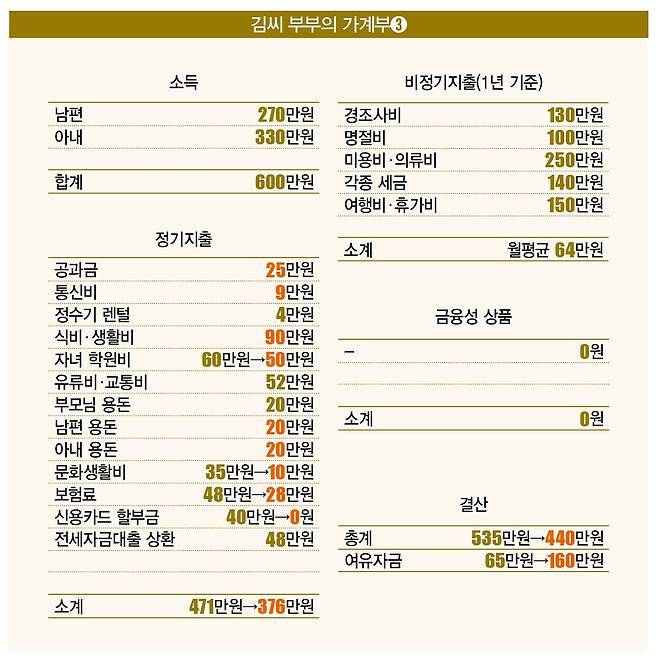 이렇게 부부의 지출 줄이기를 무사히 마쳤다. 부부는 보험료 20만원(48만→28만원), 신용카드 할부금 40만원(40만→0원), 문화생활비 25만원(35만→10만원), 자녀 학원비 10만원(60만→50만원) 등 95만원을 절약하는 데 성공했다. 따라서 부부의 여유자금은 65만원에서 160만원으로 크게 늘어났다.