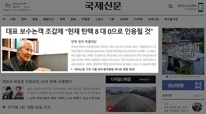 | ▲ 국제신문 26일자 <대표 보수논객 조갑제 "헌재 탄핵 8대 0으로 인용될 것"> 기사 갈무리 |