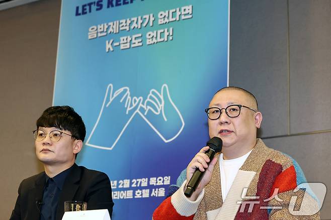 대중음악 5개 단체는 이날 뉴진스의 사례를 들어 전속계약이 유지된 상태에서 벌어지는 분쟁이 K-팝 산업의 안정성을 흔드는 요소로 작용하고 있다며 무분별한 여론전 중단 및 국회와 정부에 정책 지원을 촉구했다. 2025.2.27/뉴스1