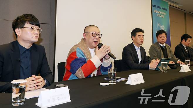(서울=뉴스1) 민경석 기자 = 최재우 F&F 엔터테인먼트 대표가 27일 오전 서울 서초구 JW메리어트호텔에서 열린 '음악산업의 공정한 권리 보호를 위한 음반제작사 기자회견'에서 발언을 하고 있다.