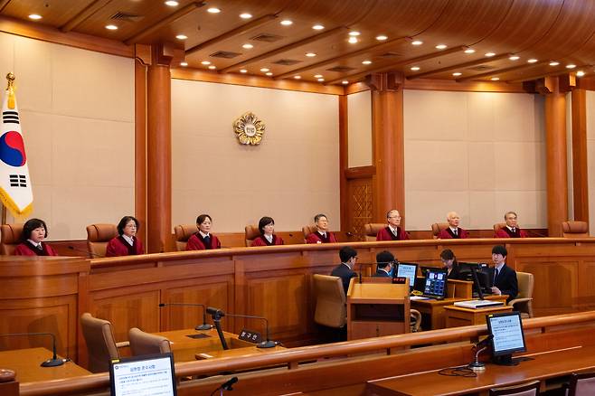 | ▲ 27일 서울 종로구 헌법재판소에서 열린 '마은혁 임명보류' 권한쟁의 선고에 문형배 헌법재판소장 권한대행을 비롯한 헌법재판관들이 참석해 있다. 2025.2.27 [공동취재] |