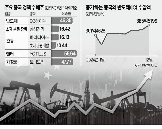 중국 정부의 내수 부양책과 한한령(한류 콘텐츠 금지령) 해제 기대에 반도체, 관광, 엔터테인먼트주가 일제히 상승하고 있다.