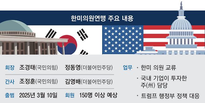 72년간 이어진 한미동맹이 행정부와 기업 간 협력을 넘어 ‘의회 정치’로 지평을 넓힌다. 여야는 다음달 한미의원연맹을 공식 출범하고 의회 외교에 힘을 싣기로 했다. 한미동맹 강화는 물론 도널드 트럼프 2기 행정부를 맞아 대대적인 통상·관세 전쟁이 벌어진 가운데 한국 상황을 미국 의회에 적극적으로 알리는 역할을 맡기로 했다.