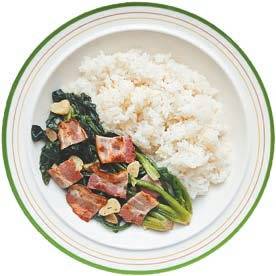 시금치 120g, 베이컨 2줄, 굴소스 0.5큰술, 마늘 2톨, 올리브유 3큰술, 공깃밥 한 그릇