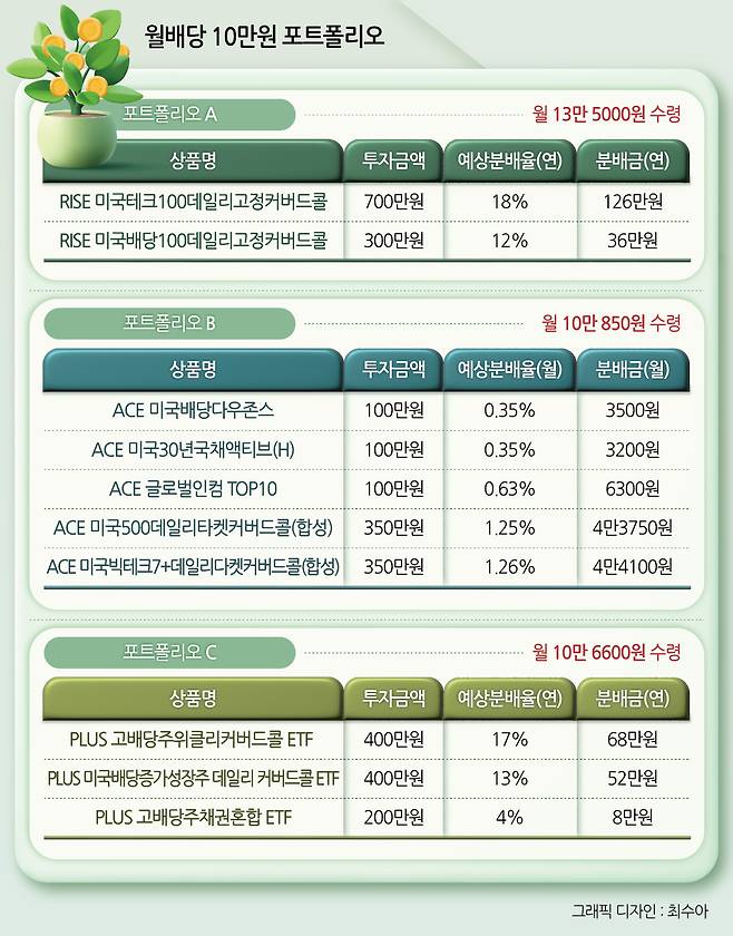 이수진 KB자산운용 ETF상품마케팅실장은 옥석을 잘 가리면 상품의 기초자산 성장에 따른 자본차익을 얻고 안정적 월 분배도 가능한 ‘두 마리 토끼’ 전략이 가능하다고 설명했다. 다만 김씨처럼 다소 공격적인 목표치를 잡은 경우라면 커버드콜 상품 비중에 무게를 투자법을 제안했다.