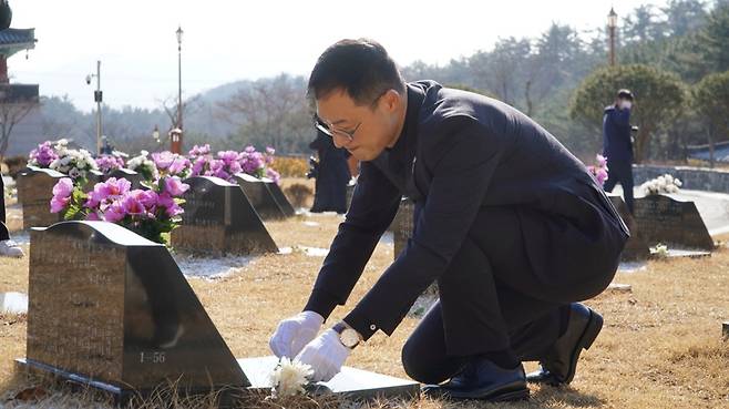 | ▲ 국민의힘 김상욱 의원이 24일 광주에 있는 국립 5·18민주묘지를 찾아 헌화하고 있다. 2025. 2. 24 |
