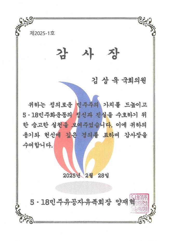 | ▲ 5·18민주유공자유족회가 28일 국민의힘 김상욱 의원에게 수여하기로 한 감사장. |