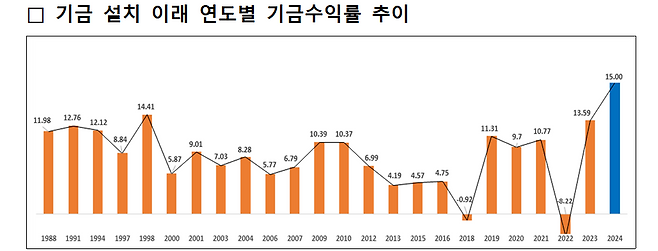 지난해 수익률은 1988년 국민연금 기금이 설치된 이후 가장 높은 수익률이다. 지난해 이전 가장 수익률이 높았던 해는 1998년(14.41%)이었는데 당시는 대부분이 채권 위주로 투자됐으며 고금리가 지속되는 환경이었다. 이에 국민연금은 13.59%의 수익률을 기록한 2023년을 이번 발표 이전까진 가장 큰 성과를 거둔 해로 평가했다.