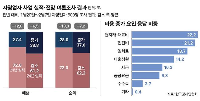 지난해 자영업자들의 사업 실적이 크게 하락한 것으로 확인됐다. 한국경제인협회는 1월20일~2월7일 모노리서치에 의뢰해 자영업자 500명을 설문조사한 결과, 응답자의 순이익은 전년 대비 13.3% 감소했다고 2월25일 밝혔다. 응답자들이 밝힌 순이익 증감 폭을 산술적으로 평균한 값이다. 순이익이 감소했다는 응답은 72.0%, 증가했다는 응답은 28.0%였다. 올해도 순이익과 매출이 줄어들 것이라는 응답은 각각 62.2%, 61.2%였다. 예상 감소 폭은 순이익 7.2%, 매출 6.5%다. 자영업자에게 가장 큰 부담은 원자재·재료비(22.2%), 인건비(21.2%), 임차료(18.7%), 대출 상환 원리금(14.2%) 등으로 나타났다.
