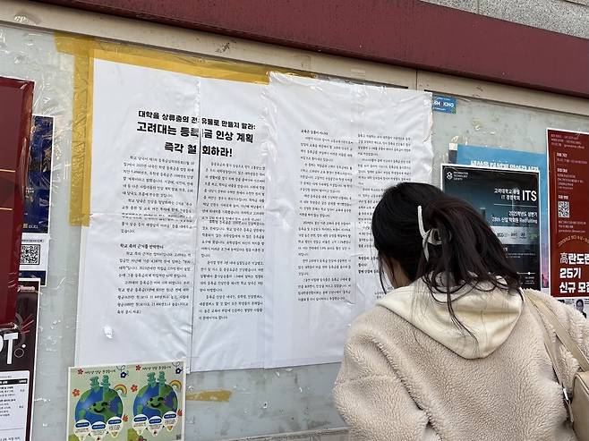 19일 고려대 후문 쪽 게시판 3곳을 확인해 보니, 등록금 인상 반대 대자보가 6개 붙어있었다. 이곳을 오가는 학생들은 대자보 앞에서 걸음을 멈추고 내용을 살피기도 했다.