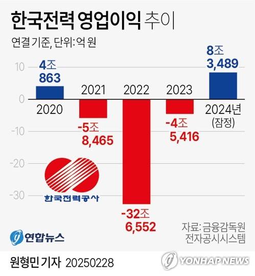 (서울=연합뉴스) 원형민 기자 = 한국전력[015760]은 작년 연결 기준 8조3천489억원의 영업이익을 낸 것으로 잠정 집계됐다고 28일 공시했다.