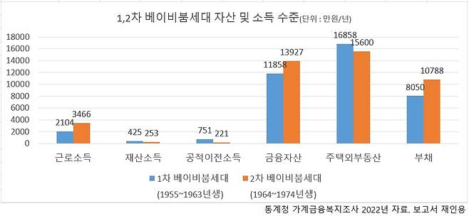 2022년 기준 1차 베이비붐세대의 연간 근로소득은 2104만원인데 비해 2차 베이비붐세대는 3466만원으로 차이를 보였고, 1차 베이비붐세대의 기초연금 등 공적이전소득은 2차 베이비붐세대의 3배 이상 많은 것으로 나타났다.