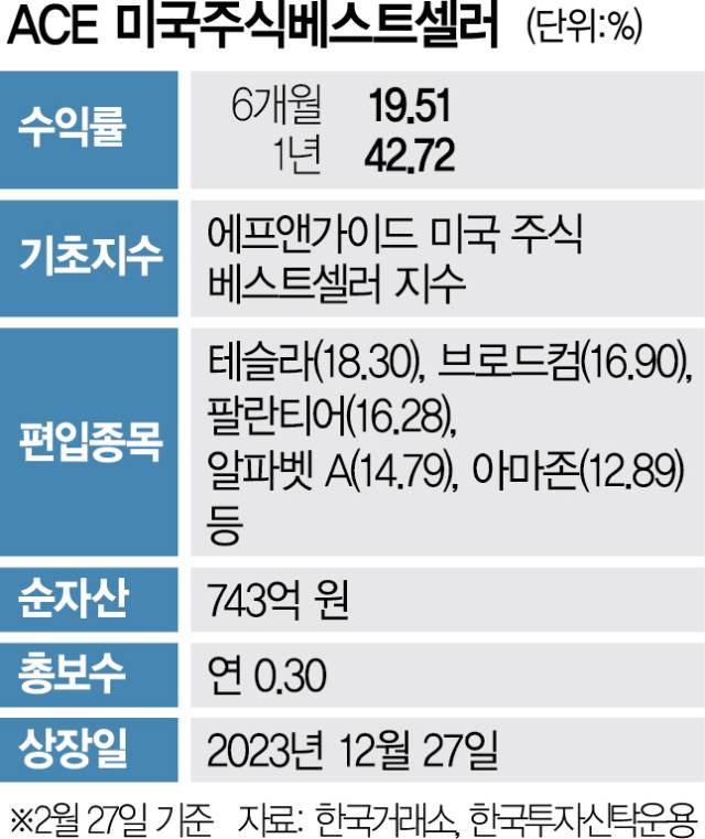 한투운용이 지난 2023년 선보인 ACE 미국주식베스트셀러 ETF는 국내 투자자가 선호하는 미국 주식 10여 개 종목을 편입한다. 별도의 환전 절차 없이 투자자들이 선호하는 해외주식을 한 번에 매입할 수 있다는 점이 눈에 띈다.