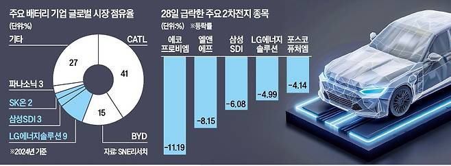중국 업체의 약진 역시 투자를 부담스럽게 하는 요인이다. 지난해 글로벌 시장에서 CATL 점유율은 41%로 2023년보다 5%포인트 상승했다. 반면 LG에너지솔루션(13%→ 9%), 삼성SDI(6%→3%), SK온(5%→2%)은 큰 폭으로 하락했다. 미국이 첨단제조생산세액공제(AMPC) 제도를 폐지 또는 축소한다면 국내 배터리 업체의 타격은 더욱 커질 전망이다. 한 자산운용사 대표는 “2차전지 업종은 바닥이 어딘지 아직 알 수 없어 투자 불확실성이 크다”고 말했다.