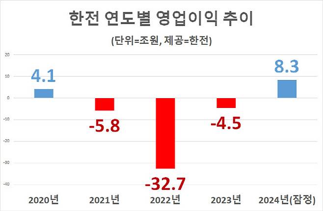 4년 만의 흑자 전환이다. 한전은 2021년 5조 8000억원의 영업손실을 내며 적자 전환한 것을 시작으로 3년 연속 적자를 기록했다. 2022년 사상 최대 규모인 32조 7000억원 적자를 낸 데 이어 2023년에도 4조 5000억원)의 적자를 냈다. 2022년 초 러시아-우크라이나 전쟁 발발로 주된 발전 연료인 천연가스 국제 시세가 2~3배씩 폭등한 데 따른 것이다.