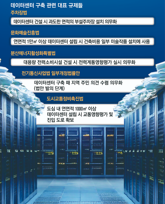 28일 한국데이터센터연합회에 따르면 국내 데이터센터 구축 과정에는 12개 법이 적용된다. 국토계획법, 건축법, 지하안전관리특별법, 도시교통정비촉진법, 소방시설법, 정보통신망법, 주차장법, 문화예술진흥법, 전기사업법, 분산에너지활성화특별법(분산법), 에너지이용합리화법, 녹색건축물조성지원법 등이다. 시설물 안전과 전력의 효율적 사용 등을 위한 합리적 규제도 있지만 현실과 동떨어진 규제도 적지 않다.