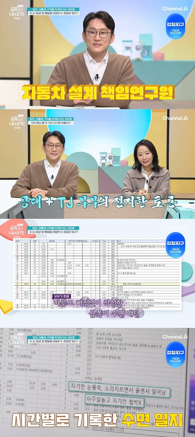 이날 방송에서는 철저히 계획하는 J형 육아를 하는 부부가 등장해 놀라움을 자아냈다. 이들 부부는 자동차 설계를 담당하는 연구원 부부로 입사 동기라 밝혔다. 3세 딸의 수면 패턴을 분석하고, 화장실 가는 시간, 육아 교대 시간, 깨는 시간 등을 데이터화해서 관리했다.
