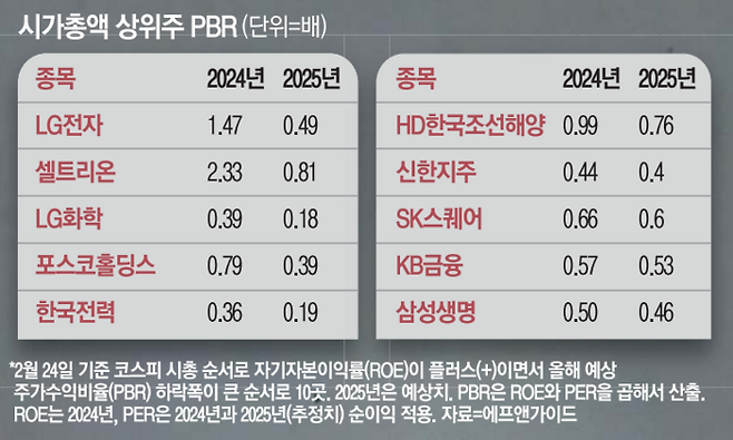 24일 기준 코스피 시총 상위 30개 종목을 분석했다. ROE와 2025년 예상 순익은 에프앤가이드 추정치를 적용했다. 2024년은 상장사들이 발표한 잠정 실적이다. 30곳 중 2024년 PBR에서 2025년 예상 PBR이 가장 크게 떨어진 3곳은 LG전자, 셀트리온, LG화학이다.