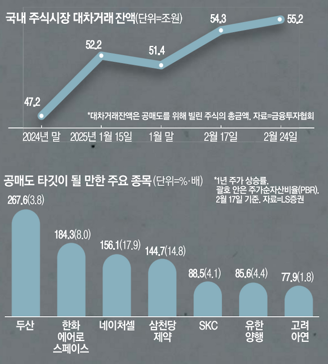 지난 2월 24일 금융위원회는 오는 3월 말부터 공매도를 전면 재개한다고 발표했다. 이날 개별 종목의 움직임은 실제 공매도 재개 이후의 가늠자가 될 것이란 분석이 많았다. 이날 코스피 개별 종목 중 대차거래 상위 1~3위는 삼성전자, 삼성중공업, 두산에너빌리티였다. 2·3위 주가는 서로 엇갈렸는데 이는 대차잔액 증가 속도로 설명이 가능하다.