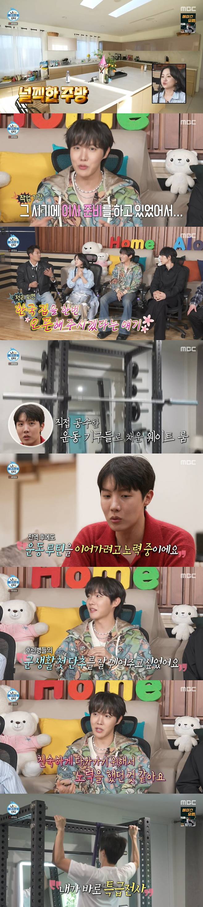 직접 공수한 운동 기구들로 웨이트룸을 채운 제이홉은 "로망 중 하나가 개인 운동을 할 수 있는 공간이다. 군대에서도 꾸준히 운동했다. 나름 특급전사 출신이다. 운동 루틴을 이어나가려고 노력했다"며 "건강, 컨디션을 위해서 운동을 해야겠다고 생각을 했다"고 전했다.
