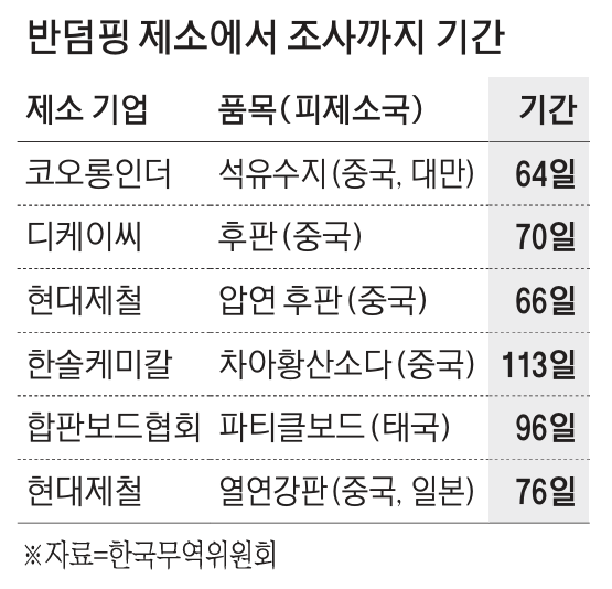 산업계에서는 정부의 더딘 무역구제 조사에도 불만을 내비치고 있다. 기업들이 무역구제 조사 신청을 하면 통상 2개월 이내에 조사 결정이 이뤄져야 하지만 조사 개시까지 60일을 훌쩍 넘는 경우가 많기 때문이다. 오는 3월 4일부터 시작하는 중국·일본산 열연강판 덤핑 조사는 신청 후 76일이 걸렸고 최근 잠정관세가 부과된 중국산 스테인리스스틸 후판의 경우에도 조사 개시까지 70일이 걸렸다.