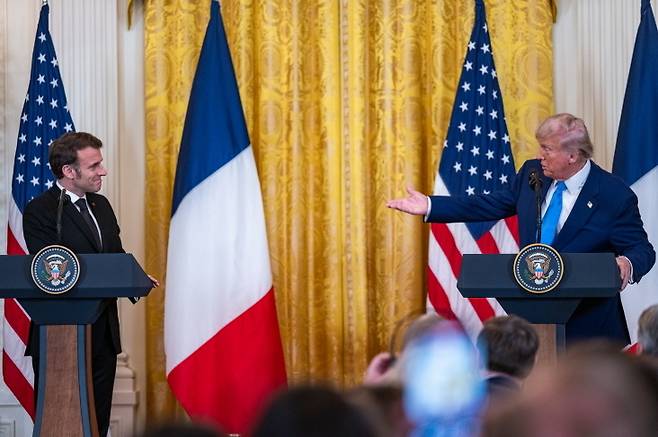 [2025년 2월 24일 에마뉘엘 마크롱(왼쪽) 프랑스 대통령과 도널드 트럼프(오른쪽) 미국 대통령이 정상회담을 마친 후 미국 워싱턴DC 백악관의 이스트룸에서 공동 기자회견을 하고 있다. (워싱턴DC UPI=연합뉴스)]