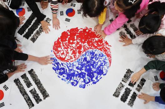 [제106주년 3·1절을 이틀 앞둔 27일 경기도 수원시 권선구 세류1동 새마을문고 책먹는 아이들에서 열린 '나라사랑 한마음 손도장 태극기 만들기' 행사에서 어린이들이 손도장 태극기를 만들고 있다. (사진=연합뉴스)]