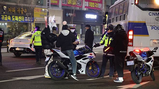 ▲ 삼일절인 1일 오전 충남 천안시 동남구 신부동 일대에 폭주 행위가 벌어져 단속에 나선 경찰이 오토바이 운전자들의 번호판과 면허증 등을 확인하고 있다.