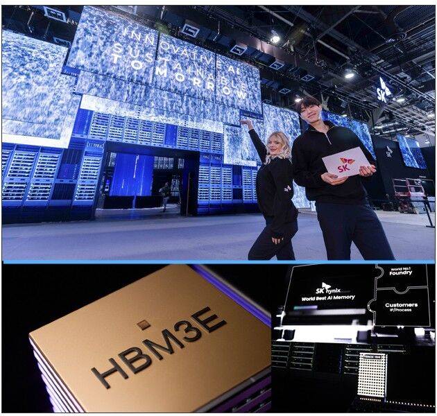 <CES2025 SK전시관 입구 ‘혁신의 문’(위), 및 메모리 기술 관련 부스에 전시된 하이닉스 HBM3E 실물(아래 왼쪽)>