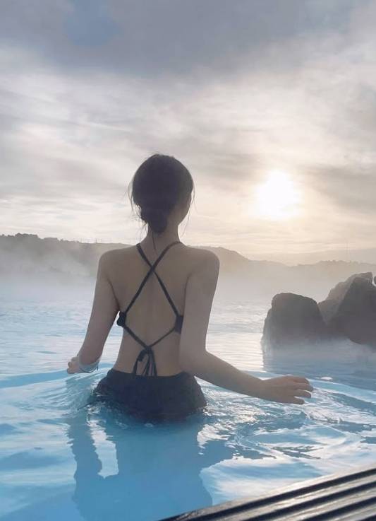 사진 속 엄지는 추운 풍경 속에서 따뜻한 풀에 수영복 차림으로 몸을 담그고 여유를 만끽했다. 특히 블랙 컬러의 수영복 차림이 눈을 끌었는데, 상반신을 대부분 가린 블랙컬러의 수영복은 등과 허리선을 시원하게 드러내 반전매력을 선사한다.