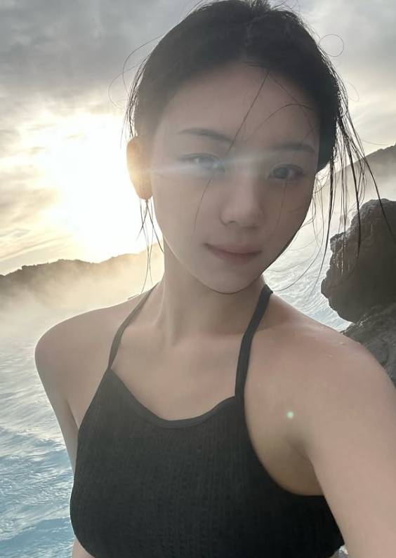 사진 속 엄지는 추운 풍경 속에서 따뜻한 풀에 수영복 차림으로 몸을 담그고 여유를 만끽했다. 특히 블랙 컬러의 수영복 차림이 눈을 끌었는데, 상반신을 대부분 가린 블랙컬러의 수영복은 등과 허리선을 시원하게 드러내 반전매력을 선사한다.