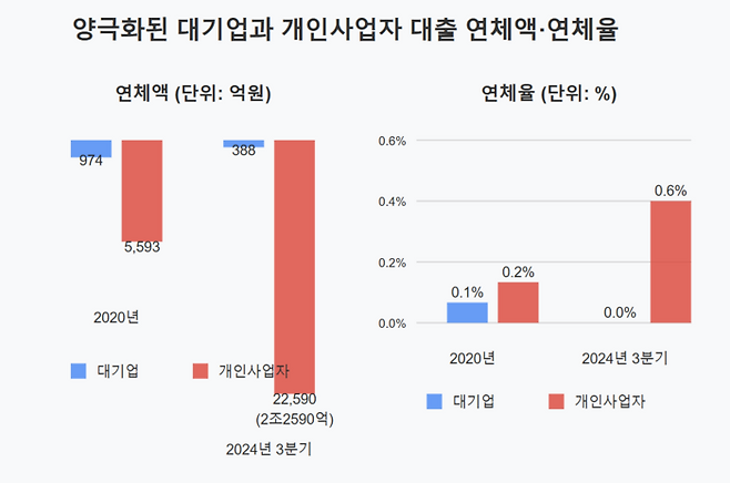 이와 대조적으로 같은 기간 대기업의 연체액은 974억원에서 388억원으로 약 60% 감소했다. 연체율도 0.1%에서 0.0%로 오히려 떨어졌다. 대기업 전체 대출액도 자영업자와 마찬가지로 2020년 말 80조7373억원에서 2024년 3분기 165조1722억원으로 약 2배 늘었다는 점에서 이러한 차이는 더 극명하게 나타난다.