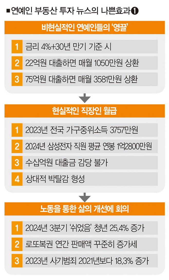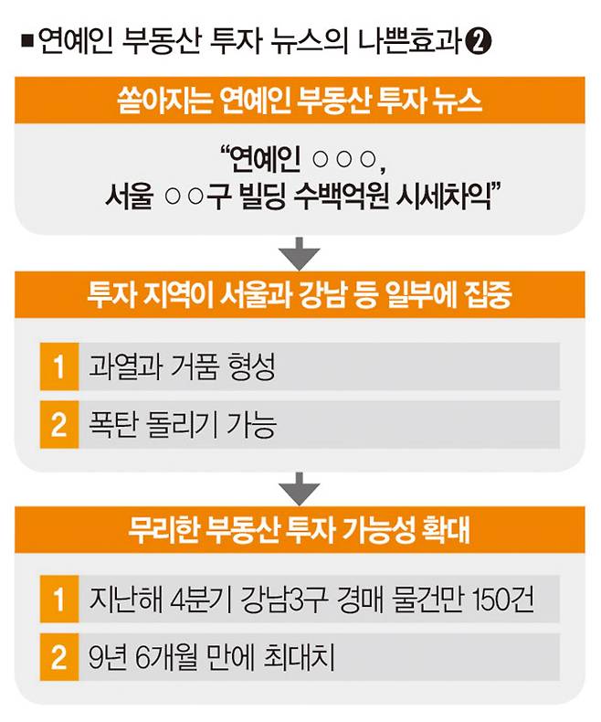 # 그런데 '연예인 투자 뉴스'를 볼 때마다 드는 의문이 있습니다. 이게 과연 공익적일까 하는 겁니다. 수많은 연쇄효과를 감안하면, '연예인'을 내세운 부동산 투자 뉴스가 한국 경제에 되레 악영향을 미칠지 모른다는 생각도 듭니다. 정말 그럴까요? 더스쿠프가 그래서 따져봤습니다.