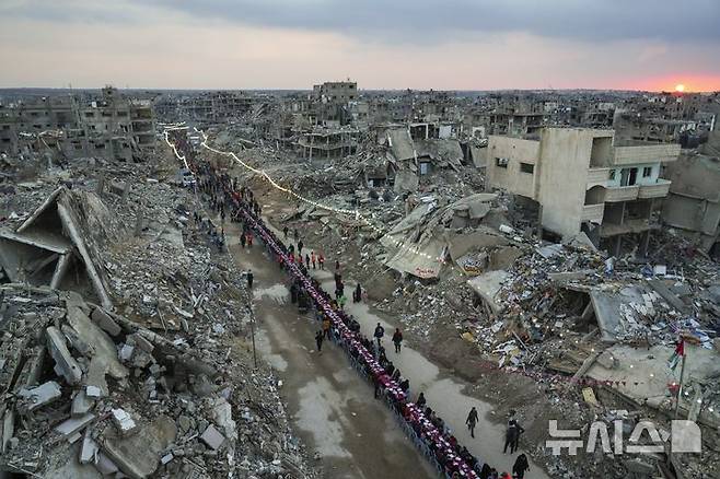 [라파=AP/뉴시스] 라마단 첫날인 1일(현지 시간) 가자지구 남부 라파에서 팔레스타인 주민들이 파괴된 집과 건물 잔해에 둘러싸인 커다란 식탁에 모여 앉아 이프타르(금식 종료 후 식사)를 함께하고 있다. 2025.03.02.