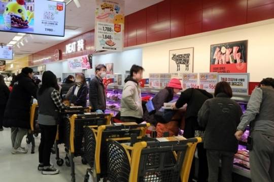 은평점은 지난달 28일 150여명이, 전날에는 250여명이 삼겹살을 구매하려고 점포 입구 앞에서 대기해 장사진을 이뤘고 용산점에서도 매일 200명 안팎의 고객이 줄을 서서 기다렸다고 이마트는 전했다.