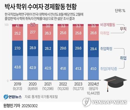 (서울=연합뉴스) 원형민 기자 = 2일 통계청 국가통계포털에 따르면 '2024년 국내 신규 박사 학위 취득자 조사' 결과 응답자 1만442명 중 현재 재직 중이거나 취업이 확정된 비율은 70.4%로 집계됐다.