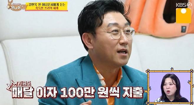 김현욱은 또 "거기서 멈춰야 했는데 소셜 커머스로 2억 원을 탕진하고 석유, 석탄 등의 사업을 했다. 그러다 아나운서 전문 교육기관을 열어 1년에 1억 씩 투자를 했다. 나중에 알았는데 회사를 처음 만든 형이 대출을 받은 게 있더라. 그걸 그대로 떠안아서 지금도 매달 이자만 100만 원 씩 나간다"고 고백, 놀라움을 자아냈다.