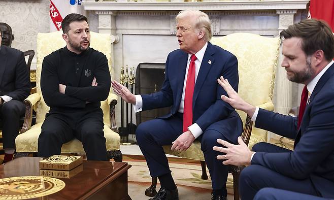 | 거친 논쟁 28일(현지시간) 미국 워싱턴 백악관에서 열린 우크라이나 전쟁 종전과 광물협정 서명을 위한 정상회담에서 도널드 트럼프 미국 대통령(가운데)과 J D 밴스 부통령(오른쪽)이 손을 들어 볼로디미르 젤렌스키 우크라이나 대통령의 발언을 제지하고 있다. 워싱턴=EPA연합뉴스 |