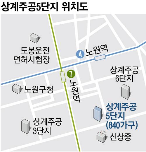 서울 노원구 상계동 721 일대에 위치한 상계주공5단지는 1987년 준공된 840가구 규모 노후 아파트다. 이 단지는 재건축을 통해 지하 3층~지상 35층 996가구로 탈바꿈할 예정이다. 이 단지는 지하철 4·7호선 노원역과 가깝고 용적률도 93%에 불과해 노원 재건축의 선두 주자로 주목받았다.