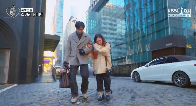 강남역 대로변을 나란히 걷는 두 사람. 김숙은 "이렇게 대로변을 남자랑 같이 걷는거 처음이다. 주변에 커플이 많다"고 하다가 비탈길에서 미끌어질것 같아서 "잠깐 잡아도 될까요?"라며 구본승에게 팔짱을 꼈다.