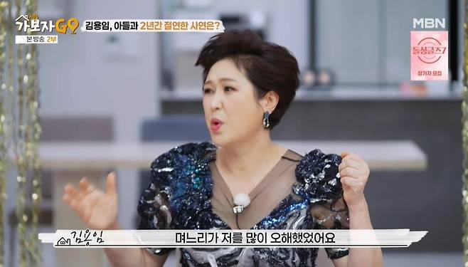 김용임 남매들도 결혼을 반대했다고. 김용임은 "언니가 얼마 전에 제부만큼 좋은 사람이 없다고 하고, 사람 잘못 봐서 미안하다고 했다"고 했다. 아들은 엄마의 의견을 따르겠다고 했다. 하지만 아들이 혼전임신을 고백하자 김용임은 결혼을 반대했다고. 김용임은 책임져야 한단 아들에게 "네가 날개를 펴고 날아야 하는데 너무 아깝다고 했다. 결혼할 때 우여곡절이 있어서 아들과 안 봤다. 며느리가 절 오해를 많이 했다"며 2년 가까이 절연했다고 털어놓았다.