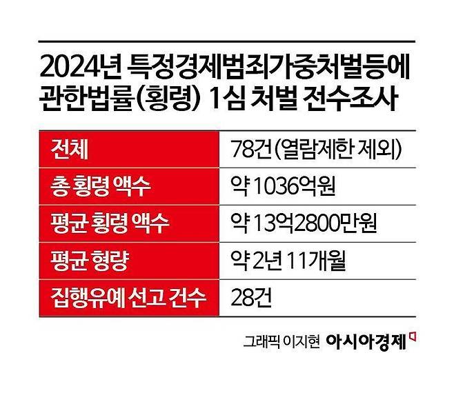 3일 아시아경제가 지난해 특정경제범죄가중처벌등에관한법률(횡령) 혐의로 처벌받은 78건의 1심 판결문(열람제한 제외)을 전수조사한 결과, 이들의 총 횡령 액수는 약 1036억원, 건당 평균 13억2800만원으로 집계됐다. 이들이 처벌 받은 평균 형량은 2년11개월이다. 1개월마다 약 3800만원의 죗값을 치르는 셈이다.징역형과 함께 집행유예를 선고받은 경우는 28건에 달했다.