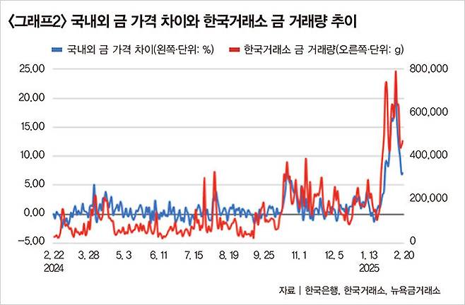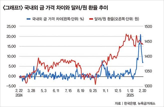 그런데 한국거래소에서 거래되는 금 가격은 1g에 14만6570원으로 글로벌 시세보다 7.3%가량 비싸다. 이러한 국내외 금 가격 차이는 2월 14일 20.9%까지 벌어졌으며 이를 두고 일각에서는 "금 가격에 김치 프리미엄이 붙었다"고 표현한다. '김치 프리미엄'은 한국 가상자산거래소에서 거래되는 암호화폐 가격이 해외보다 높게 형성되는 현상을 뜻하는 말인데, 금 가격에도 이러한 이상 현상이 발생했다는 의미다.