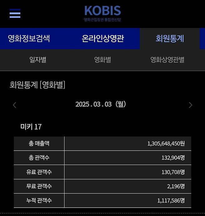 영화진흥위원회 통합전산망에 따르면 '미키 17'은 3일 오전 6시 55분 기준, 누적 관객 수 111만 7,586명을 기록했다. 삼일절 연휴 내내 박스오피스 1위를 차지했다.