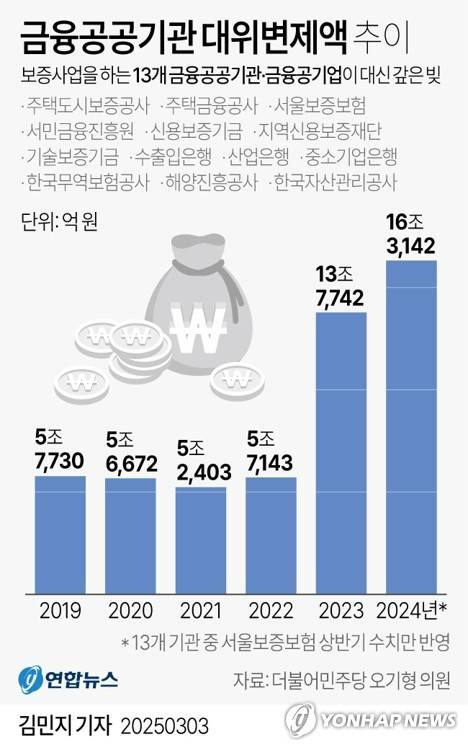(서울=연합뉴스) 김민지 기자 = 3일 국회 기획재정위원회 소속 오기형 더불어민주당 의원이 보증사업을 하는 13개 금융공공기관·금융공기업에서 제출받은 자료에 따르면 이들 보증기관의 지난해 대위변제액은 16조3천142억원으로 역대 최다를 기록했다.